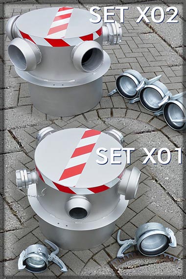 Die SET WP25 ist vorrangig für die gefahrlose Ausleitung von großen Fördermengen in offene Abflüsse (z.B. Fließgewässer) konzipiert. Zugleich verfügt sie über das gleiche Einsatzspektrum wie alle anderen SET-Typen. Sie verfügt über drei Perrot-Kardankupplungen ø 216 mm und einen DIN-Storz A-Anschluss ø 110 mm (letzterer dient auch zum Entleeren der SET nach Verwendung als 'freier Auslauf'). |